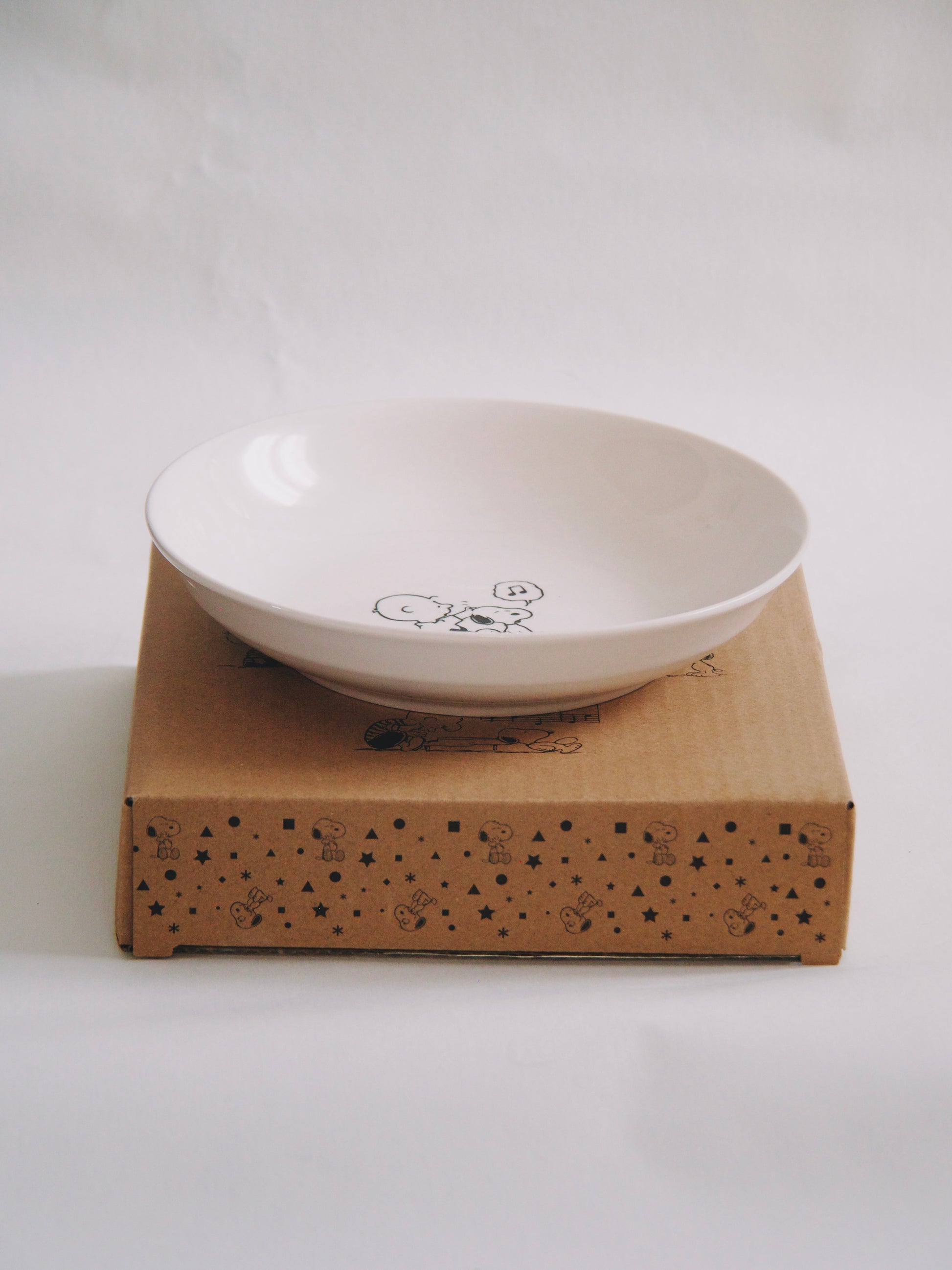 Assiette creuse de collection Snoopy en céramique avec Snoopy et Charlie Brown, accompagné de son emballage d'origine.