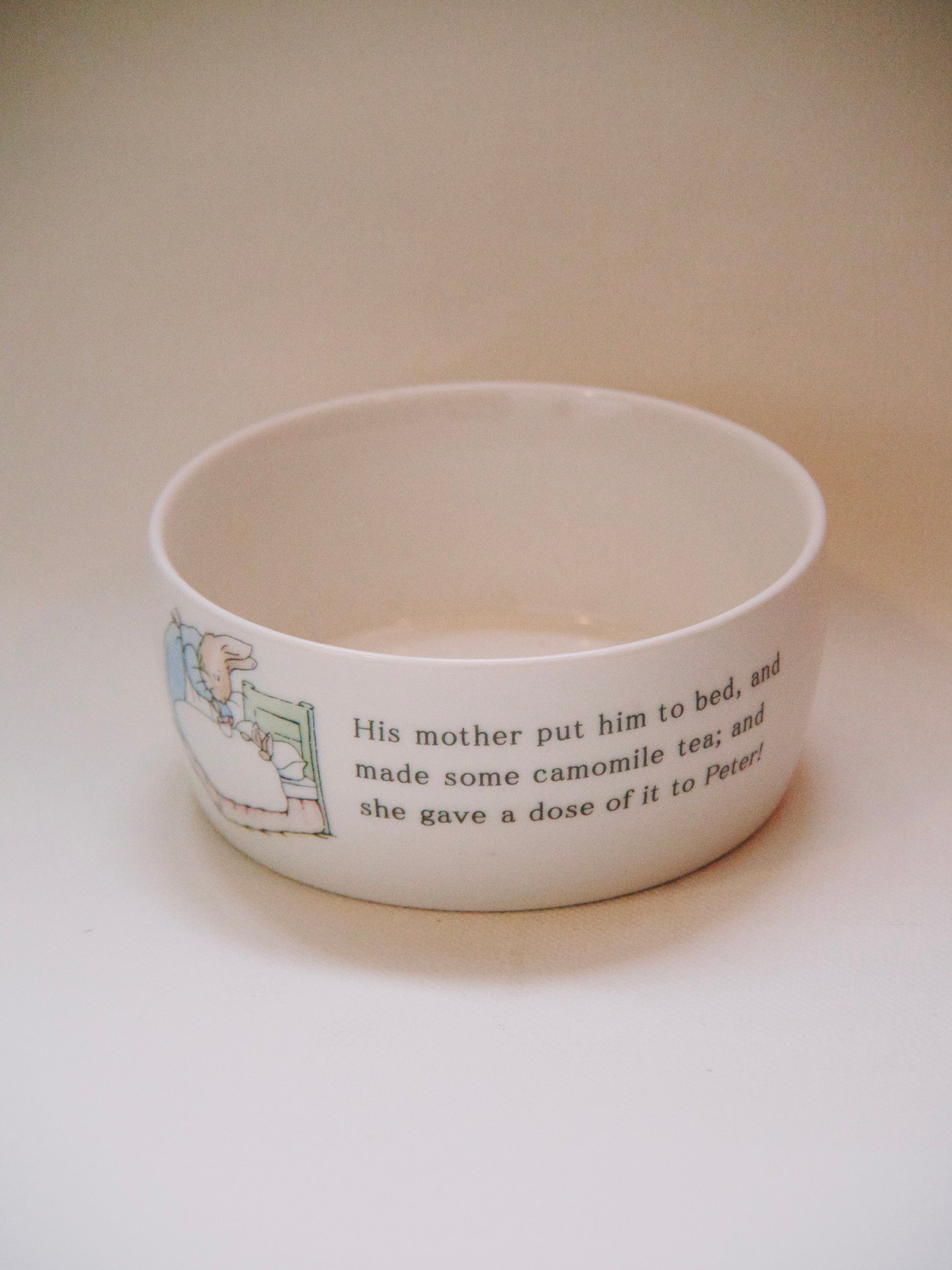 Ce bol, de la collection Nursery Ware est particulièrement charmant car il illustre la fin du conte, lorsque Pierre, épuisé et un peu malade après ses aventures, reçoit une tisane de camomille de sa mère.