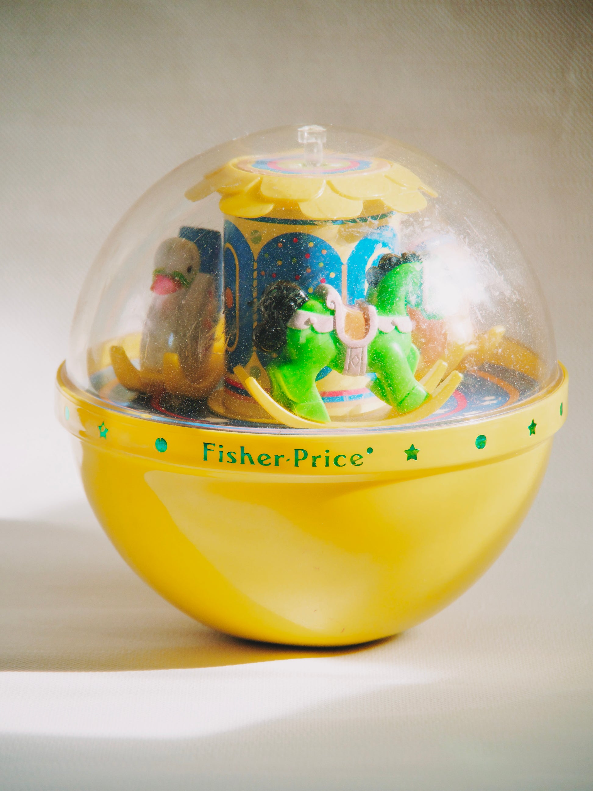 Ce culbuto jaune fait bouger les personnages et tinte d'une douce mélodie quand on le bouscule. Un jouet culte et vintage de marque Fisher Price