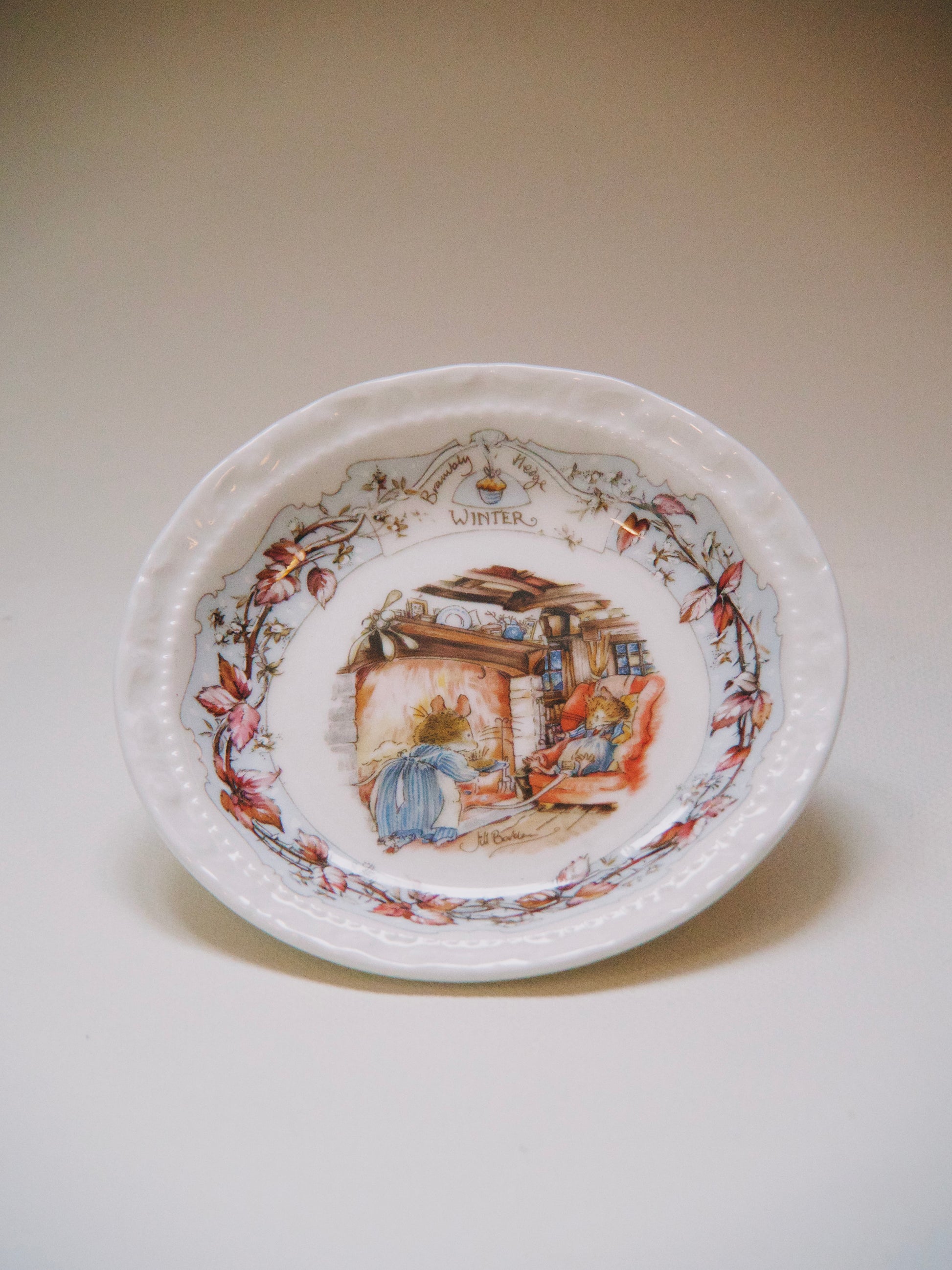 Issue de la collection des saison, cette jolie soucoupe manufacturée par Royal Doulton, raconte l'hiver au Buisson aux mûres, la poétique aventure des saisons par Jill Barklem.