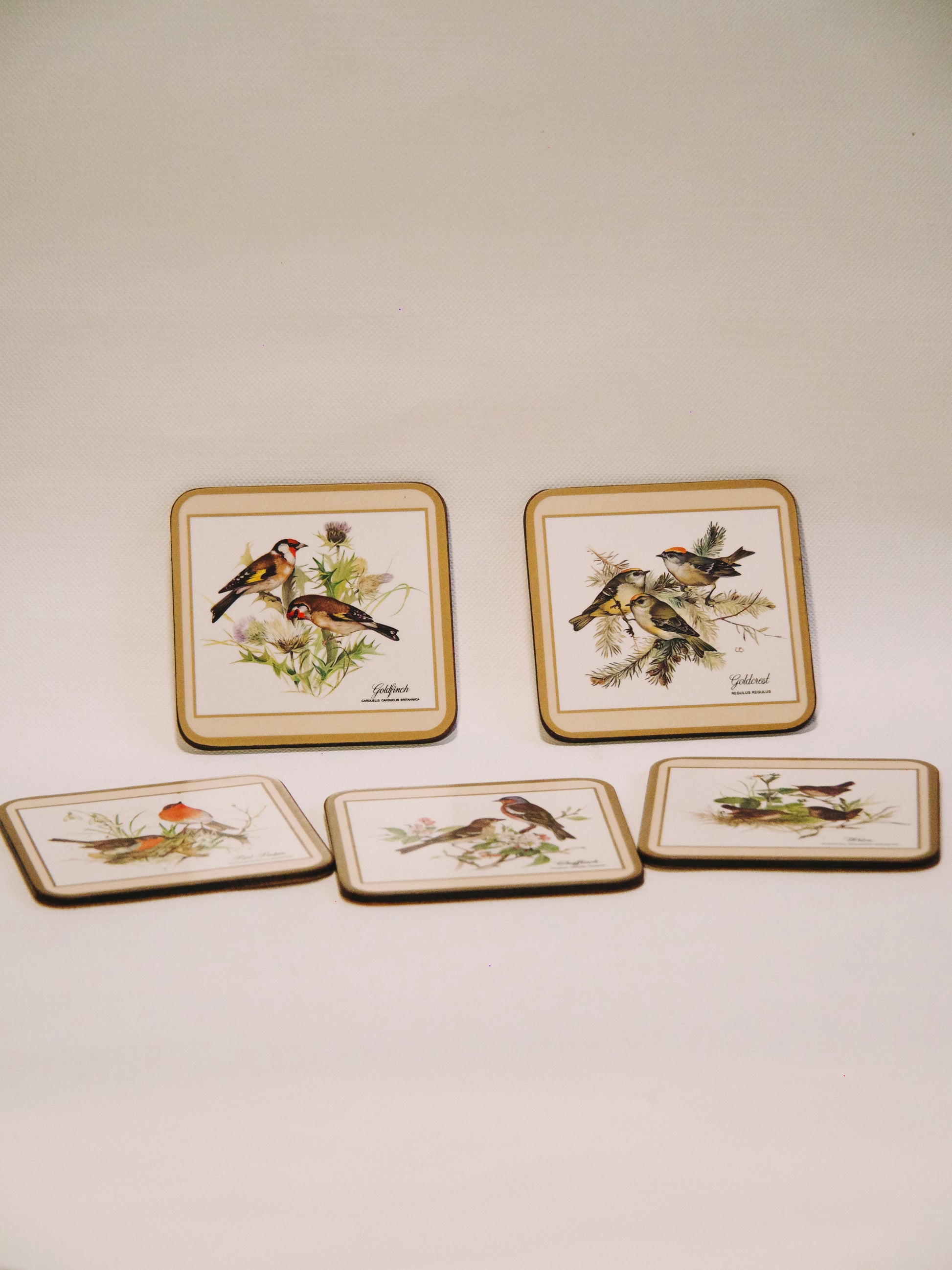 Les espèces représentées : On y retrouve des couples de Chardonnerets (Goldfinch), de Roitelets (Goldcrest) et d'autres passereaux (Pinson, Rouge-gorge...) nichés dans leur habitat naturel.